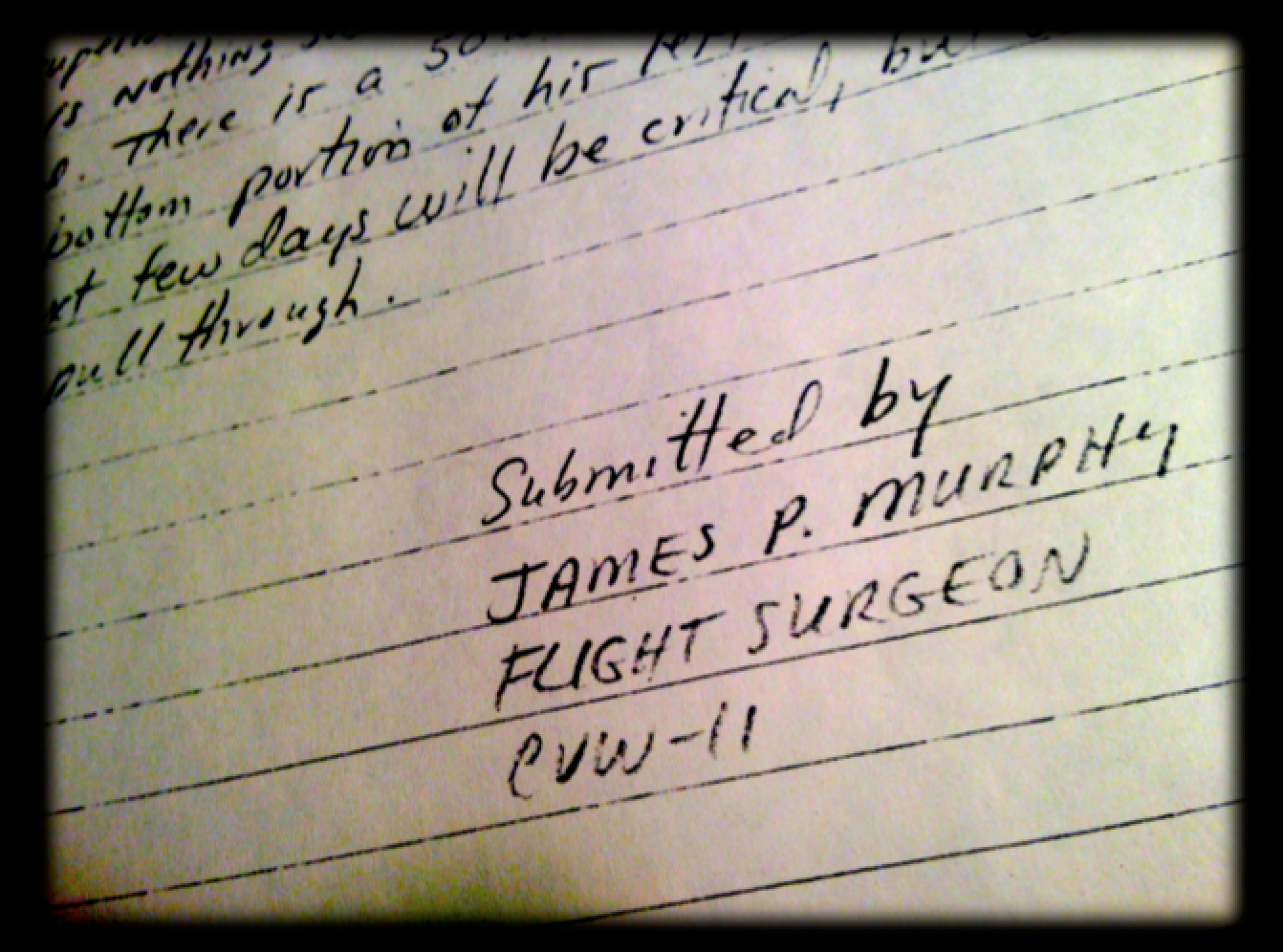 I feel like I’m getting back in a groove. My depression over having left Subic Bay has lifted. Also my mishap board (Flight Surgeon’s report) is complete.