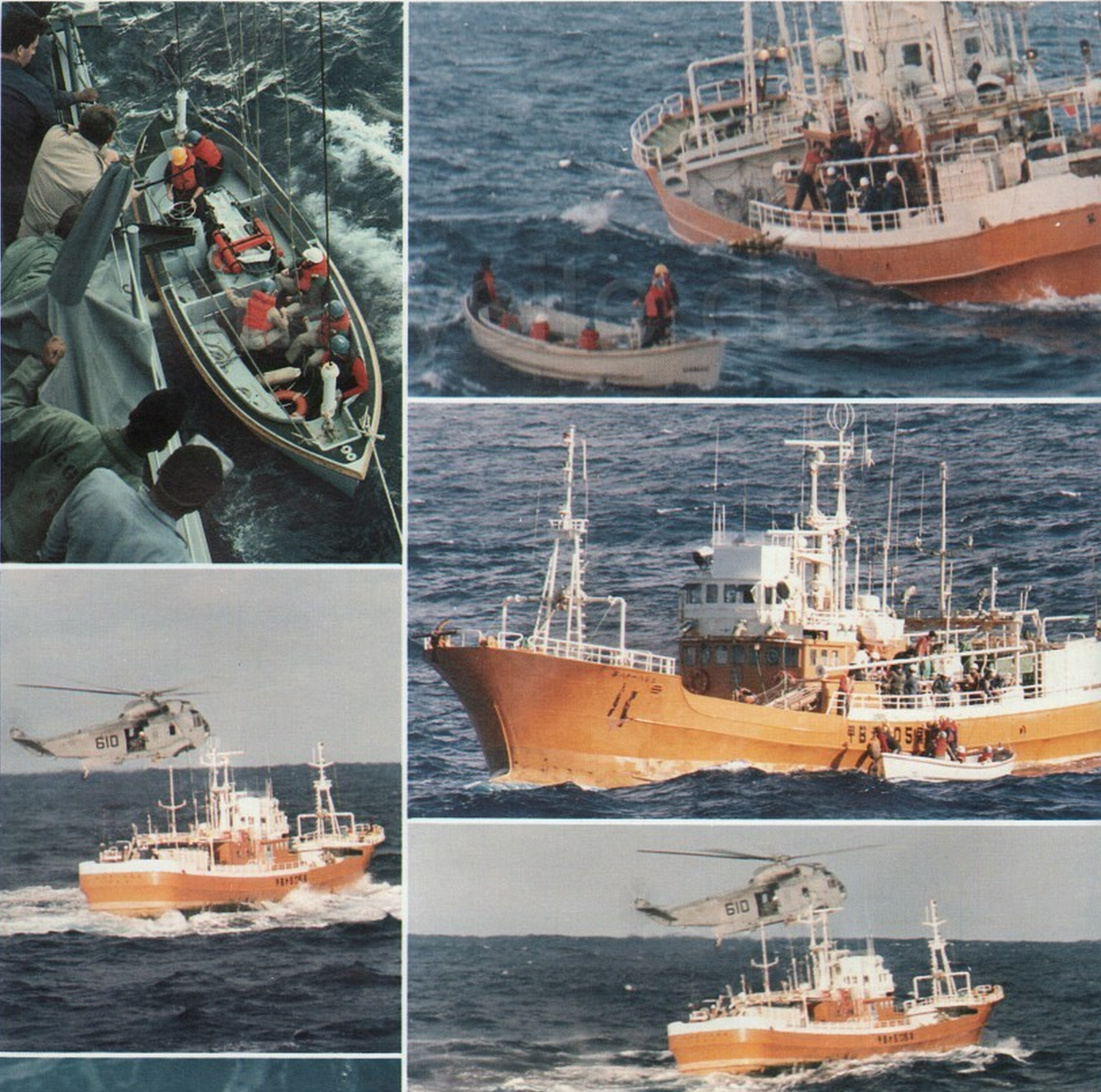 The helo hovered just off the port side of the vessel as AW-3 Dion left the aircraft. Slowly he was lowered on an incline and eventually onto the waiting deck; but not before what seemed like dozens of large ocean swells pitched the fishing boat up and down, rising almost parallel with the hovering aircraft (the boat’s mast coming within four feet of the helo during one large swell).