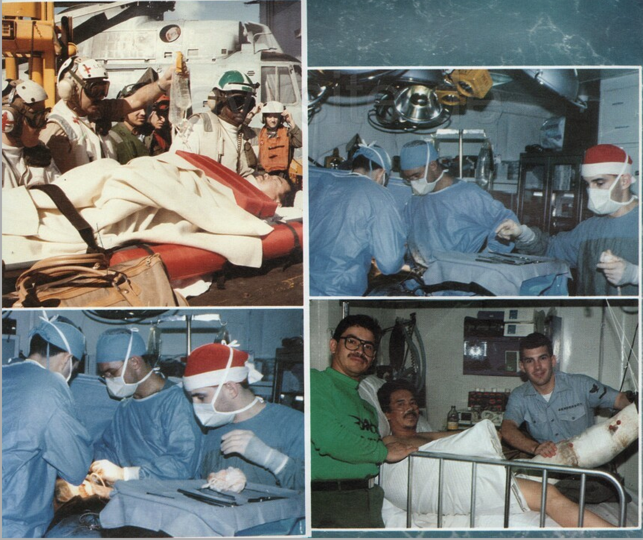 Now in the Enterprise medical department, the injured fisherman was promptly taken to surgery. Our ship’s surgeon, LCDR Marfing, went to work and discovered that, in addition to the life-threatening open fracture, the victim had ruptured his spleen and was on the verge of bleeding to death, even as his blood volume was being restored. LCDR Marfing performed an exploratory laparotomy, removed the spleen, and debrided the necrotic tissue. The Japanese fisherman is still in surgery as I write this narrative.